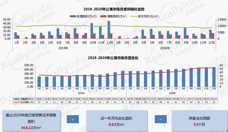 【公寓市場情況】公寓市場整體供大于求,供、銷、價較19年均有所下降;2020年公寓新增供應190.38萬㎡,銷售 103.47萬㎡,均價9150元/㎡,存量454.22萬㎡,需53個月(約4.4年)才能去化完。