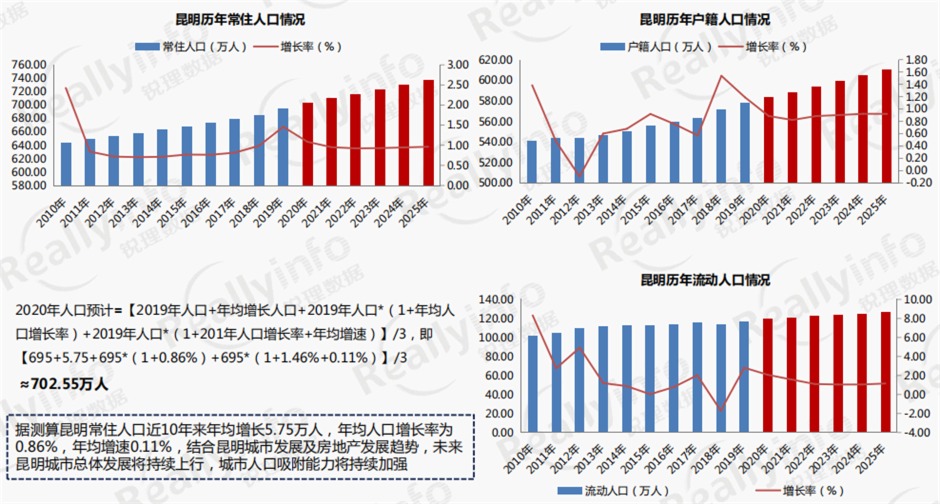 【人口潛力】2019年末昆明城市人口695萬人,通過人口增長率、年均增長人口數和年均增速,據此測算2020年昆明 人口將達到702.55萬人左右,2025年將達到736.31萬人左右,其中戶籍人口610.09萬人、流動人口126.22萬人。