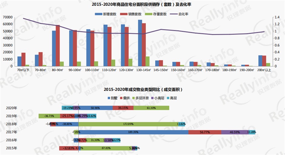 【產品供銷結構】目前昆明市場還是以80-145㎡剛需、剛改產品為主;但是從2020年的各物業類型的成交環比指數分析,改善類物業將是未來趨勢。