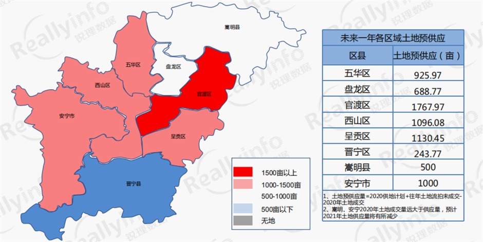 【土地供應預測】根據《昆明市2020年度土地儲備供應計劃》今年供應土地將達到3.11萬畝,預計2021年官渡、五 華、呈貢將持續將整合城市外拓區域土地,尤其是官渡區將借空港新區發展之勢大幅增加土地供應,近郊方面嵩明、安寧 2020年土地成交量遠大于供應量,但安寧今年土地市場火爆,預計明年將持續大幅供地。