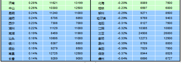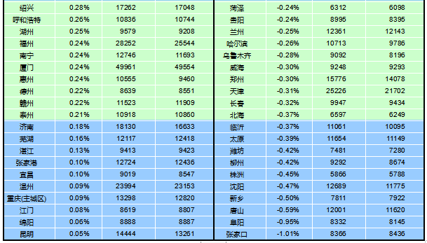 2021年1月,衡水、桂林等14個城市新建住宅價格同比下跌。其中,衡水、桂林同比分別下跌3.10%、2.70%;菏澤、洛陽、北海和福州同比跌幅均在1.0%-2.0%之間;新鄉、贛州等8個城市跌幅均在1.0%以內。