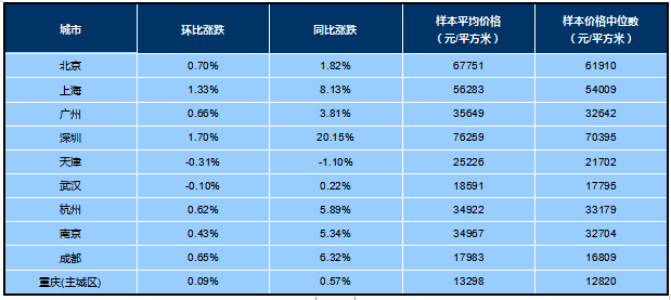 根據百城新建住宅價格指數對北京、上海等十大城市樣本調查數據顯示,2021年1月十大城市新建住宅平均價格為28660元/平方米,環比上漲0.46%,漲幅較上月擴大0.15個百分點。十大城市中,8個城市環比上漲,上漲城市數量較上月減少1個;2個城市環比下跌,下跌城市數量較上月增加1個。具體來看,上海、成都、南京、廣州、杭州以及重慶(主城區)環比漲幅均在0.5%(含)-0.8%(含)之間;武漢、天津漲幅較小,環比分別上漲0.09%和0.08%。深圳、北京新建住宅價格環比分別下跌0.08%和0.06%。