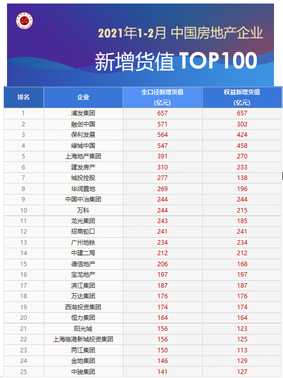 從新增貨值來看,浦發(fā)集團(tuán)、融創(chuàng)中國和保利發(fā)展占據(jù)榜單前三位。2021年1-2月,浦發(fā)集團(tuán)以累計(jì)新增貨值657億元占據(jù)榜單第一;融創(chuàng)中國和保利發(fā)展緊隨其后,累計(jì)新增貨值規(guī)模分別為571億元和564億元。TOP10企業(yè)1-2月新增貨值總額4073億元,占TOP100企業(yè)的32.9%,新增貨值門檻為244億元。
