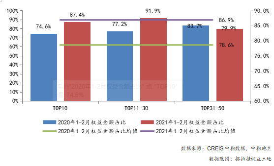 圖:2021年1-2月50家代表房企各陣營招拍掛權(quán)益金額占比