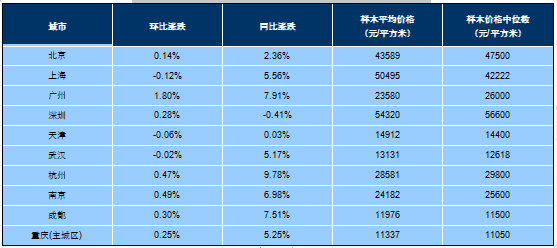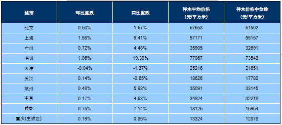 同比來看,十大城市新建住宅平均價格同比上漲4.86%,漲幅較上月擴(kuò)大0.38個百分點(diǎn)。十大城市中,除深圳同比下跌0.41%外,其余城市同比均上漲。具體來看,杭州、廣州、成都、南京、上海、重慶(主城區(qū))以及武漢新建住宅價格同比漲幅均在5.0%-10.0%之間;北京以及天津漲幅在3.0%以內(nèi),其中天津同比漲幅相對較小,為0.03%。
