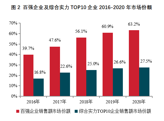 百強企業(yè)市場份額小幅擴大,行業(yè)集中度持續(xù)提升。2020年,百強企業(yè)銷售額市場份額上升至63.2%,較上年提高2.3個百分點,但增幅繼續(xù)回落。其中,綜合實力TOP10企業(yè)銷售額市場份額為27.5%,較上年提高0.9個百分點。