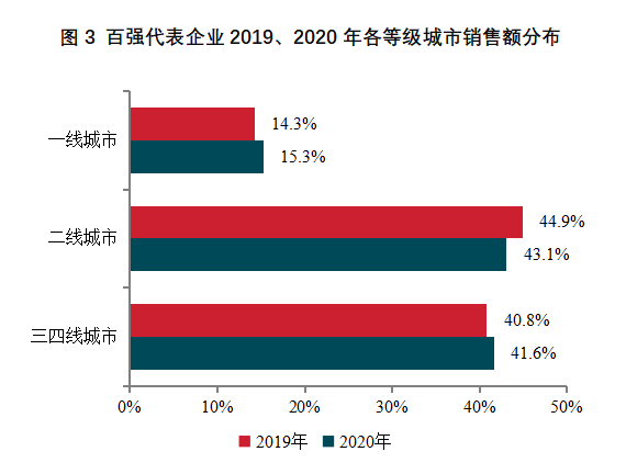 2020年,百強企業(yè)把握熱點城市政策窗口期,抓住城市復蘇機遇積極搶收,一線及三四線城市成交占比提升。從50家百強代表企業(yè)重點項目銷售情況來看,一線城市受供應改善、需求釋放等因素影響,銷售額占比較上年小幅上升1.0個百分點至15.3%;二線城市占比為43.1%,較上年下降1.8個百分點;三四線城市全年受疫情影響相對較小,疊加宏觀信貸環(huán)境寬松及地方支持政策等因素,銷售額占比增長0.8個百分點至41.6%。