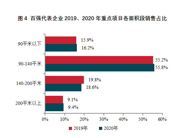 2020年,百強企業(yè)加大首置、首改類產(chǎn)品的推出比例,推動企業(yè)銷售業(yè)績的穩(wěn)步增長。從50家百強代表企業(yè)重點項目各面積段產(chǎn)品的銷售額占比來看:90-140平米首改類產(chǎn)品銷售額占比達55.8%,較上年提升0.6個百分點;90平米以下首置類占比為16.2%,較上年均提升0.3個百分點。此外,百強企業(yè)加速對產(chǎn)品進行迭代升級,同時圍繞客戶深層次需求,注重健康、社交等要素,以差異化產(chǎn)品贏得市場。
