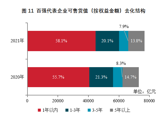 強代表企業(yè)的可售貨值結(jié)構(gòu)進一步得以優(yōu)化,短期內(nèi)去化壓力較小。研究組以2016-2020年為研究區(qū)間,基于百強企業(yè)的新增貨值情況、代表城市的出清周期,對其可售貨值結(jié)構(gòu)進行分析研究。從可售貨值結(jié)構(gòu)來看,其中的58.1%可在1年內(nèi)去化,與去年同期相比提升2.5個百分點,而1-3年、3-5年及5年以上的占比則均同比減少。