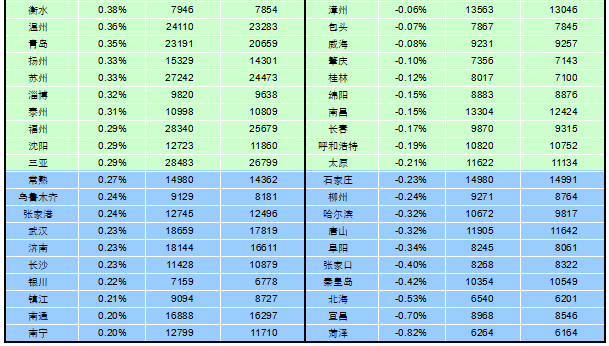 2021年3月,新建住宅價格環比下跌的城市個數為23個,較上月減少4個。其中,煙臺環比下跌0.30%;肇慶、廊坊等12個城市跌幅在0.1%(含)-0.3%之間;阜陽、天津等10個城市跌幅均在0.1%以內。