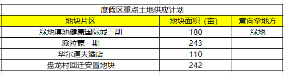 度假區今年計劃供地801畝,其中商服地塊493畝,住宅地塊308畝,商服地塊占比超6成。片區中幾個重點地塊為綠地滇池健康國際城三期、派拉蒙樂園一期、華爾道夫酒店地塊以及盤龍村回簽安置地塊。