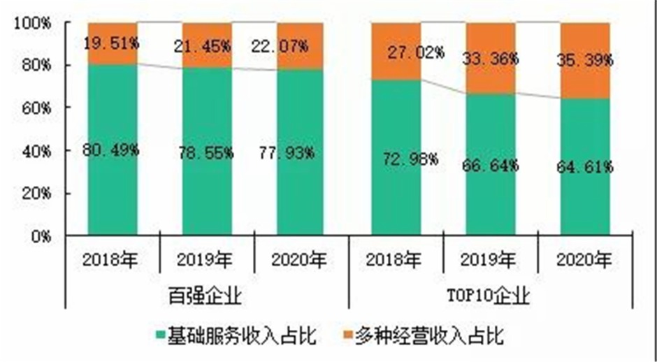 百強企業基礎服務收入占比逐年緩慢下降,2018-2020年累計下降2.56個百分點;相較而言,TOP10營收結構的改善節奏更快,2020年,TOP10企業的基礎服務收入占比達64.16%,低于百強企業超13個百分點,體現出TOP10企業在營收結構優化方面更多的主觀能動性。