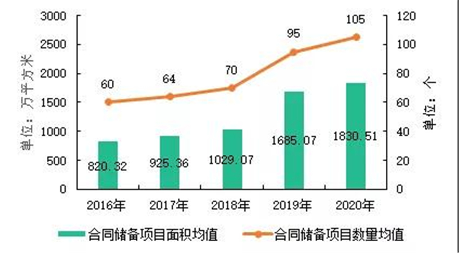 2016-2020年百強企業合同儲備面積均值及儲備項目數量均值