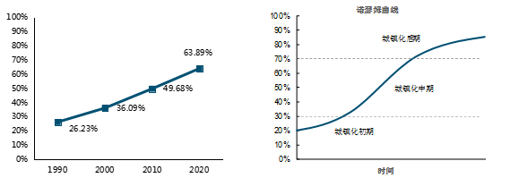 圖:我國常住人口城鎮化率變化及城鎮化“諾瑟姆曲線”示意圖