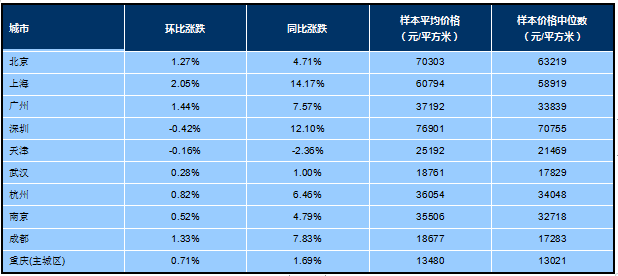 上漲2.05%,漲幅最大;廣州、成都、北京漲幅介于1.0%-1.5%之間;杭州、重慶(主城區(qū))、南京漲幅在0.5%-1.0%之間;武漢漲幅0.28%;天津、深圳環(huán)比跌幅在0.5%以內(nèi)。