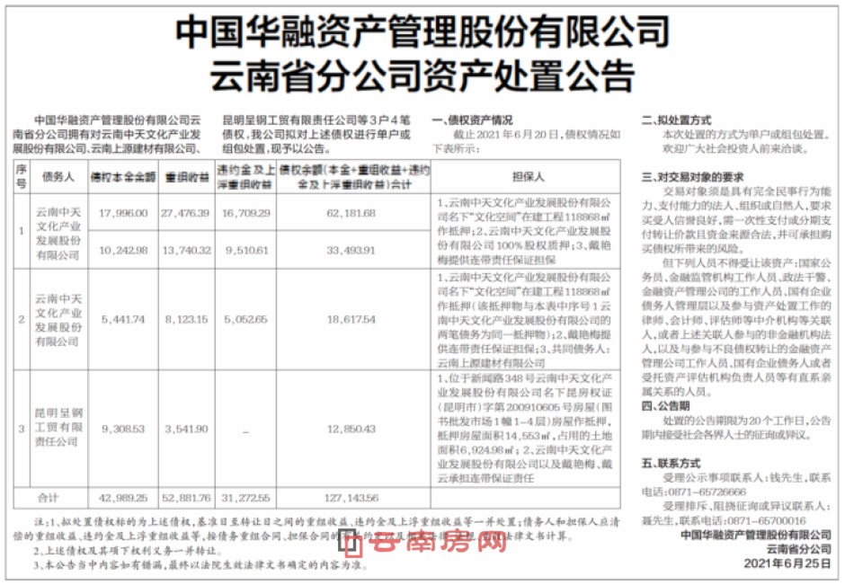 根據6月25日的公告,華融資產云南省分公司對云南中天文化產業發展股份有限公司、云南上源建材有限公司、昆明呈鋼工貿有限責任公司等3戶4筆債權余額(本金+重組收益+違約金及上浮重組收益)共127143.56萬(債權情況截止6月20日),進行單戶或組包處置。