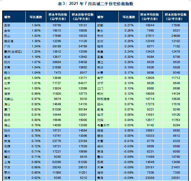 2021年7月,二手住宅價(jià)格環(huán)比上漲的城市個(gè)數(shù)為70個(gè),較上月減少7個(gè)。具體來看,西安、金華等13個(gè)城市環(huán)比漲幅在1.0%(含)-2.0%之間;淮安、馬鞍山等22個(gè)城市漲幅在0.5%-1.0%之間;贛州、溫州等30個(gè)城市漲幅在0.1%-0.5%之間;紹興、威海等5個(gè)城市漲幅在0.1%以內(nèi)。保定和宿遷兩個(gè)城市二手住宅價(jià)格均與上月持平。