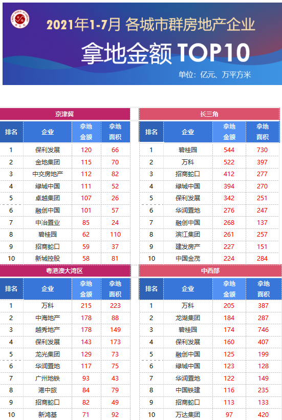 從各城市群拿地金額來看,長三角遠(yuǎn)高于其他城市群。1-7月,長三角TOP10企業(yè)拿地金額3470億元居四大城市群首位,其中,碧桂園擴(kuò)大長三角地區(qū)的戰(zhàn)略布局,7月拿地金額193億元,領(lǐng)跑長三角;中西部TOP10企業(yè)拿地金額1419億元,位列第二,其中,碧桂園同步增強(qiáng)中西部地區(qū)的拿地力度,7月拿地金額64億元,躋身中西部三甲;粵港澳大灣區(qū)TOP10企業(yè)拿地金額1290億元,位列第三,其中,萬科于7月在粵港澳大灣區(qū)拿地金額67億元,領(lǐng)跑粵港澳大灣區(qū)。拿地面積來看,中西部TOP10企業(yè)拿地面積以3091萬平方米居四大城市群首位。