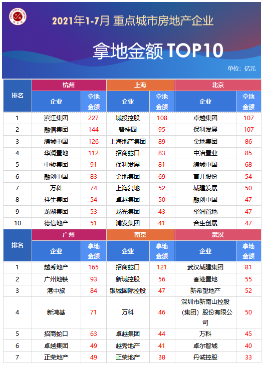 從重點(diǎn)城市拿地金額TOP10房企來看,龍頭房企仍聚焦重點(diǎn)城市的戰(zhàn)略布局。招商蛇口、萬科等全國性龍頭企業(yè)致力于在多個(gè)重點(diǎn)城市廣泛布局,招商蛇口、萬科、華潤置地、融創(chuàng)中國及卓越集團(tuán)均出現(xiàn)在3個(gè)以上1-7月重點(diǎn)城市房企拿地金額TOP10榜單中。區(qū)域性龍頭企業(yè)更加關(guān)注本區(qū)域的縱深戰(zhàn)略布局,濱江集團(tuán)于7月以6.22億元競得杭州淳安2宗地塊,今年累計(jì)拿地金額227億元,大幅度領(lǐng)跑各重點(diǎn)城市拿地金額TOP房企榜單。此外,保利發(fā)展繼續(xù)拓展北京土地資源,在北京拿地榜中與位列第一的卓越集團(tuán)持平,拿地金額均為107億元。