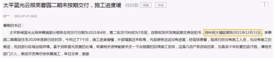 位于太平的藍光云報芙蓉園業主反映,項目按購房合同應是今年4月10日交房,但過了交房時間,項目建設依然進度緩慢、工地施工人員稀少,幾乎處于停工狀態,有爛尾的風險。開發商電話通知7月31號交房。