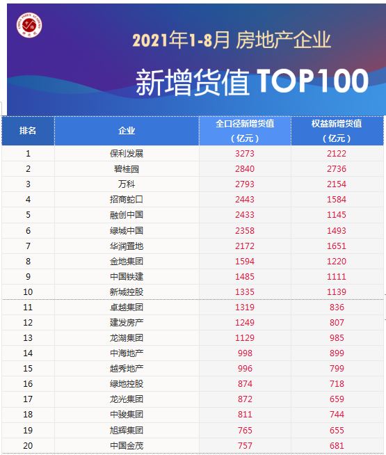 2021年1-8月,TOP100企業拿地總額18883億元,同比下降10.8%,門檻值為44億元,與去年同期54億元相比下降10億元。TOP100企業招拍掛權益拿地總額占全國300城土地出讓金的比例為54.8%,與1-7月相比下降1.5個百分點。
