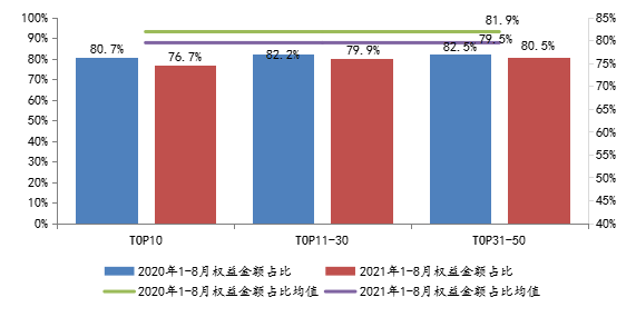50家代表房企招拍掛拿地權益金額占比小幅下降。2021年1-8月,50家代表房企招拍掛權益金額占比均值為79.5%,同比下降2.4個百分點,合作拿地力度有所提升。具體來看,與去年同期相比,1-8月前10陣營企業、11-30陣營企業以及31-50陣營企業拿地權益金額占比均值同比均有所下降,其中前10陣營企業下降了4.0個百分點,下降幅度最大。