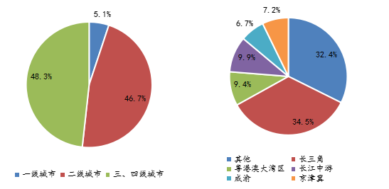 圖:2021年1-8月50家代表房企拿地面積城市等級、區域分布情況