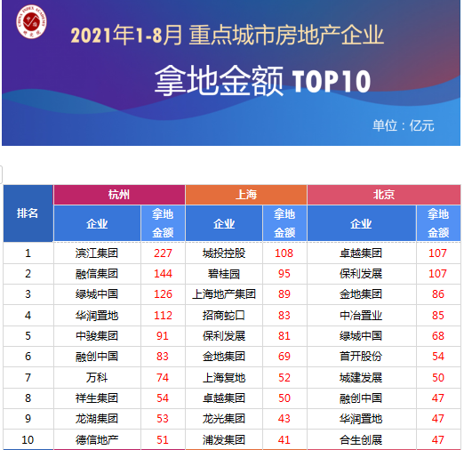 從重點城市拿地金額TOP10房企來看,龍頭房企戰略布局仍聚焦于重點城市。招商蛇口、萬科等全國性龍頭企業致力于在多個重點城市廣泛布局,招商蛇口、萬科、華潤置地、融創中國及卓越集團均出現在3個以上1-8月重點城市房企拿地金額TOP10榜單中。區域性龍頭企業更加關注本區域的縱深戰略布局,上海城投控股通過全資子公司上海城投置地4.64億元競得上海閔行區1宗地塊使用權,加強了對上海的拿地布局。