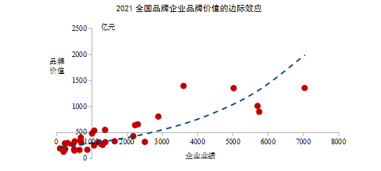 品牌價(jià)值與業(yè)績(jī)之間的關(guān)系,存在邊際效應(yīng)遞增的規(guī)律。具體來(lái)看,處于1000億以下陣營(yíng)的品牌企業(yè),單位品牌價(jià)值增長(zhǎng)帶動(dòng)業(yè)績(jī)?cè)鲩L(zhǎng)2.0億元;1000-3000億陣營(yíng)的品牌企業(yè),品牌價(jià)值均值每提升1億元帶動(dòng)業(yè)績(jī)?cè)鲩L(zhǎng)3.5億元;3000億以上陣營(yíng)的品牌企業(yè),品牌價(jià)值均值每增長(zhǎng)1億元帶動(dòng)業(yè)績(jī)?cè)鲩L(zhǎng)4.5億元。因此,銷(xiāo)售規(guī)模越大的品牌企業(yè),品牌價(jià)值的邊際效應(yīng)越大。