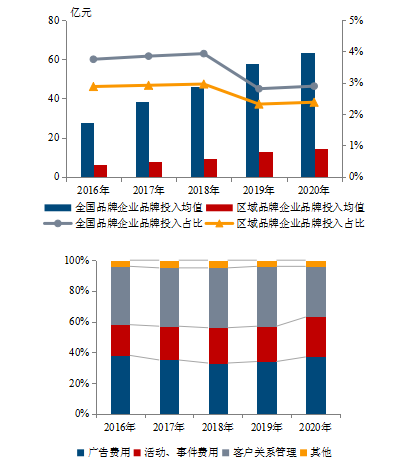 品牌投入占比小幅上升,線上營(yíng)銷(xiāo)費(fèi)用上升顯著。品牌企業(yè)加大線上傳播力度,品牌投入略有上升。2020年,全國(guó)及區(qū)域品牌企業(yè)品牌投入均值分別為63.53億元和14.23億元,占銷(xiāo)售額的比重分別為2.89%和2.38%,與去年相比小幅上升。