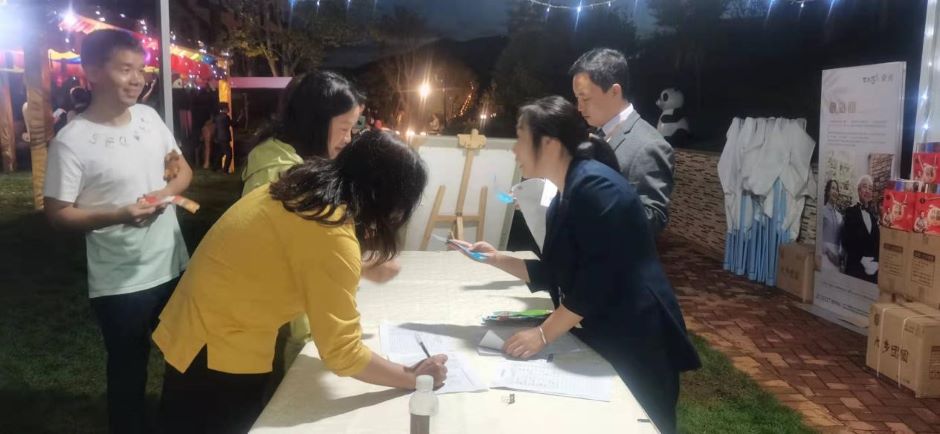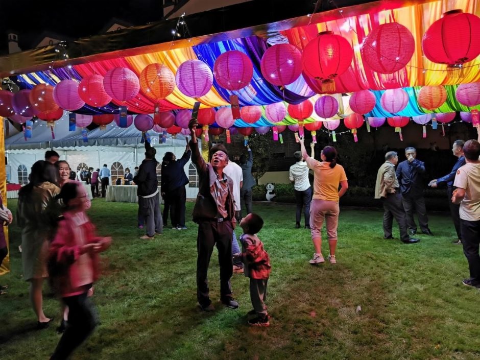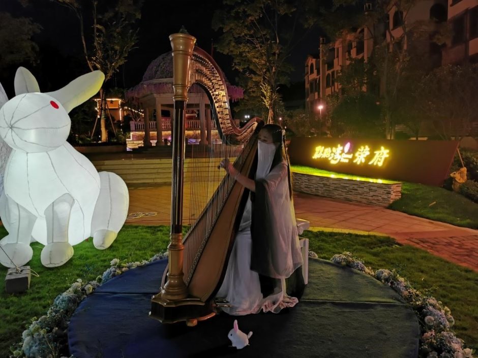 活動現場不僅有豎琴演出,還有中秋傳統活動:猜燈謎、套圈等多種節日慶祝活動。