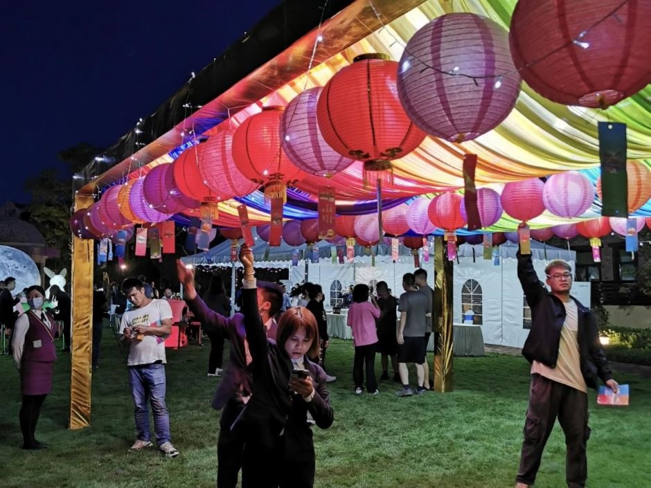 在草坪上設置有中秋主題燈謎區,懸掛燈謎條。讓嘉賓們在游戲與傳統文化相結合的情境下,探索中秋傳統文化的奧秘與樂趣。