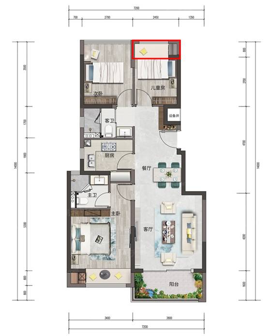 其中次臥帶寬0.8米的內陽臺,次臥陽臺半計入產權,兒童房和主臥都帶飄窗,雖然產品是毛坯交付,但均在飄窗處預留了儲物柜空間,這點比較實用。