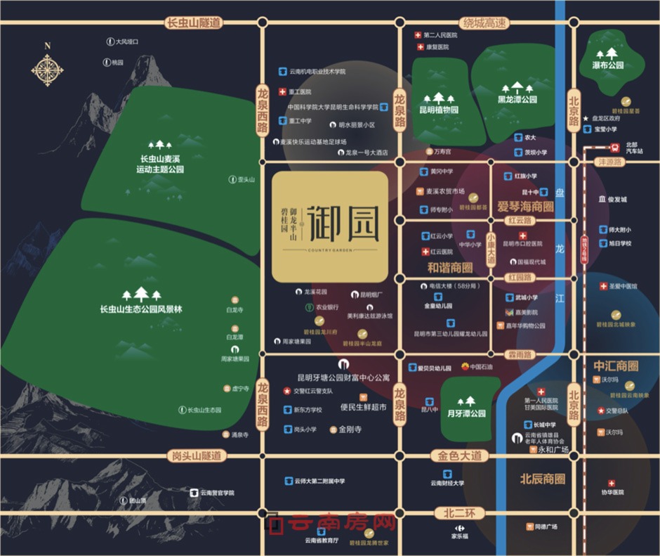 碧桂園御龍半山規劃了1所老年服務中心、2600平米的社區醫院和3000平米的生鮮超市,可完全滿足業主的日常生活需求。教育配套上,除了項目內部規劃配建的2所24班的幼兒園以及一所公立公辦的小學外,項目周邊分布有紅云小學、師專附小、昆八中、昆十中等優質教育資源,能滿足業主子女的教育需求。