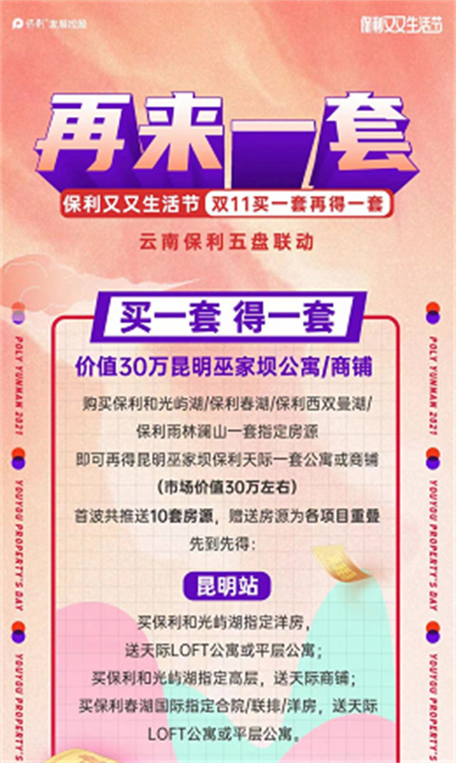 近期,保利置業推出買一套送一套購房優惠活動,即購買保利和光嶼湖、保利春湖一套指定房源,即可再得巫家壩保利天際一套價值30萬元的公寓或者商鋪,首波只有10套房源,先到先得。