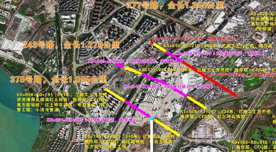 377號道路,起于萬科濱江翡翠止于會展西路。全程1258米,僅交地200米,推進16%,是8條道路中建設情況最復雜的路段。北端近萬科濱江翡翠段,有3棟房子未征遷,南段穿過永勝村段(約625米)則受到城改影響,預計到2025年才能啟動征遷。