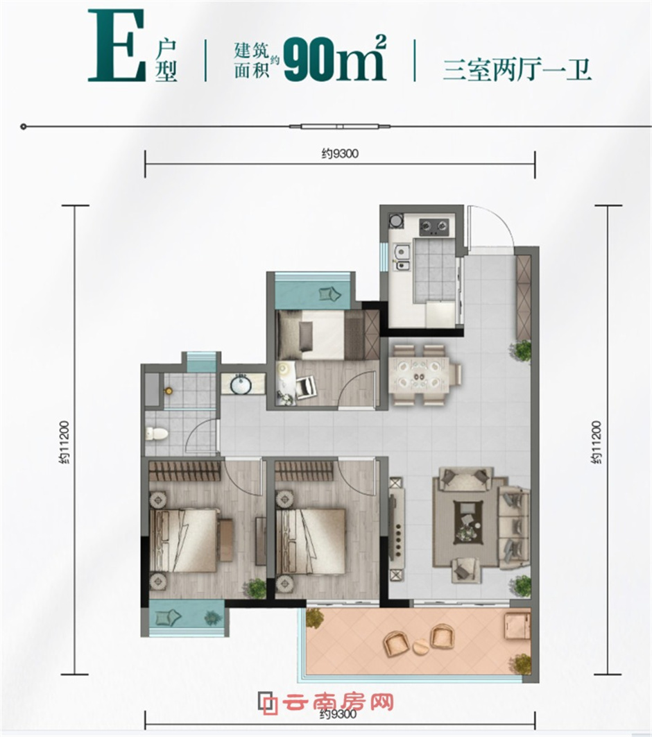 而90平米的E戶型,同樣是三房一衛,臥室跟餐客廳分開,在動靜分區方便要做得好,缺點是過道有點面積浪費。