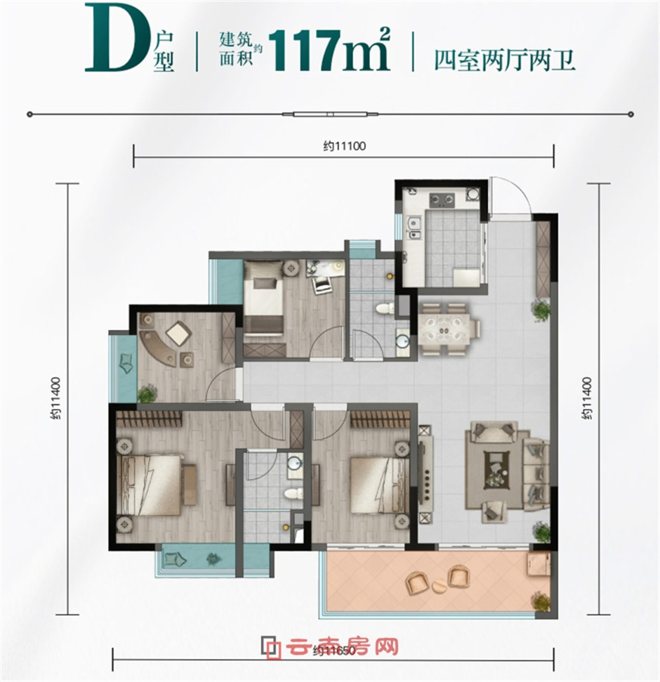 建面約117平米的D戶型是項目當前推出的洋房最大戶型,其戶型格局跟E戶型類似,不過多了一個主衛和次臥,四房的布局可同時滿足三代同堂的居住需求。