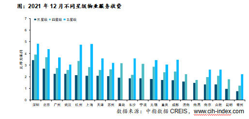 從不同星級物業服務收費來看,各星級物業服務收費同比均上漲,四星級同比漲幅最高。2021年12月,二十城整體三星級物業服務收費為2.00元/平方米/月,同比上漲0.40%;四星級物業服務收費為2.72元/平方米/月,同比上漲0.50%;五星級物業服務收費為3.75元/平方米/月,同比上漲0.38%。