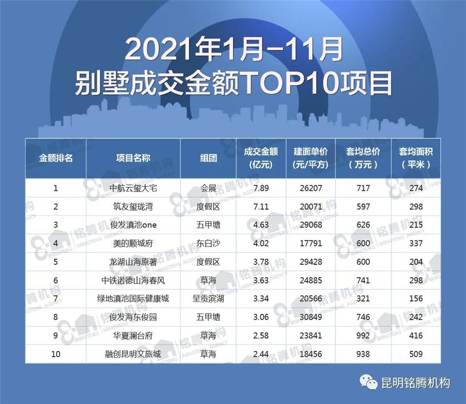 近日,昆明銘騰機構發布了一份《2021年昆明主城別墅項目銷售排行榜》,我們先來看一下榜單具體內容: