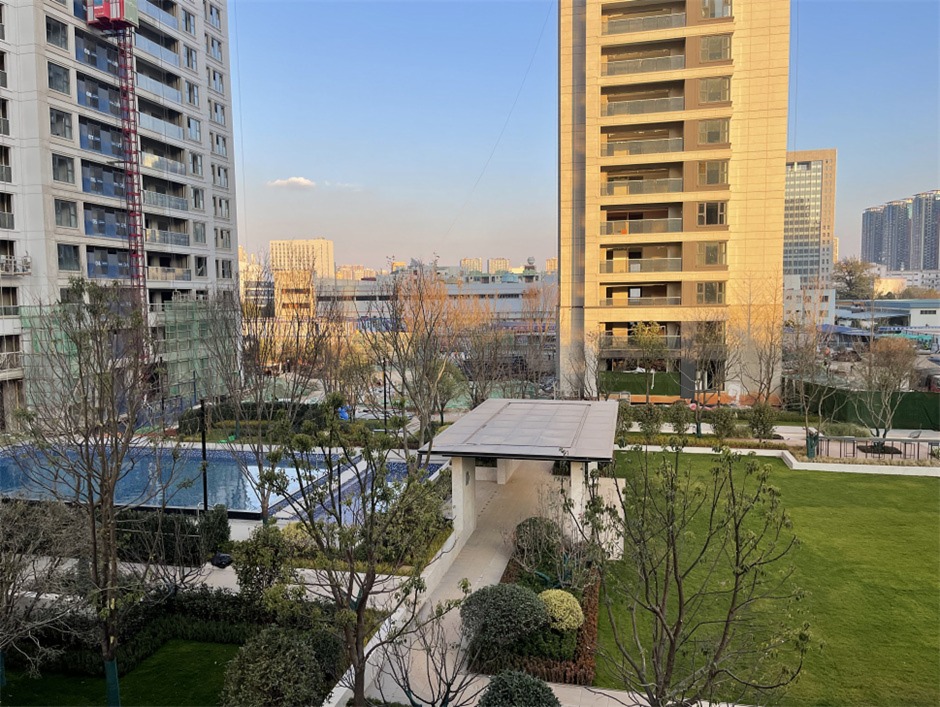 作為西邊房價“天花板”,綠城從來沒有讓人失望過,從小區外立面看,住宅已經基本封底,小區內泳池瓷磚也已經貼好,目前在安裝窗戶以及室內裝修工作,項目整體預計2023年年底交房。