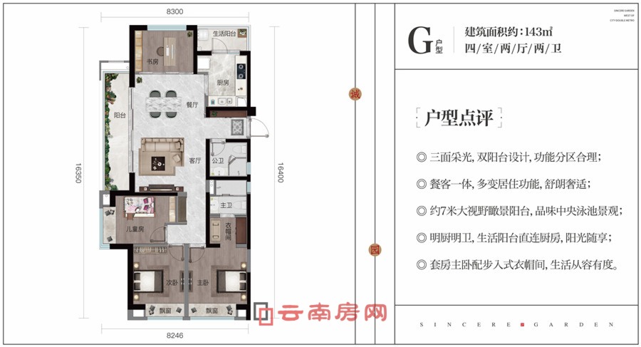 其中143平米戶型是項目推出的最大面積戶型,實體樣板間位于小區5棟3樓端戶,4室2廳2衛設計,精裝交付,裝標為2000元每平。