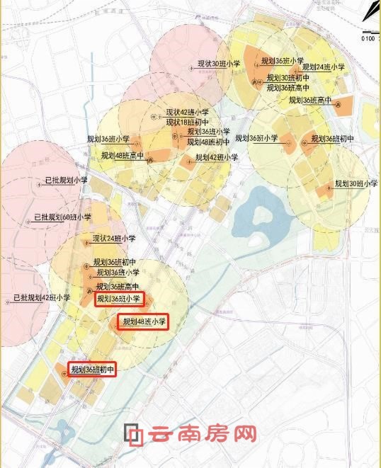 云南房網根據巫家壩教育配套規劃圖,結合3則招標公告披露的位置信息,推定這3所學校由北向南分別是規劃36班小學、規劃48班小學、規劃36班初中,見下圖。
