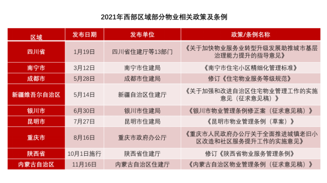 在國(guó)家層面多重政策利好的基礎(chǔ)之上,西部地區(qū)省/直轄市/自治區(qū)層面以及地級(jí)市層面,積極響應(yīng)國(guó)家指導(dǎo)性政策,結(jié)合各區(qū)域物業(yè)行業(yè)發(fā)展情況,出臺(tái)基層社區(qū)治理、物業(yè)服務(wù)標(biāo)準(zhǔn)化、保障業(yè)主權(quán)益等多項(xiàng)政策與條例,為西部物業(yè)行業(yè)持續(xù)健康有序發(fā)展提供良好的外部環(huán)境。