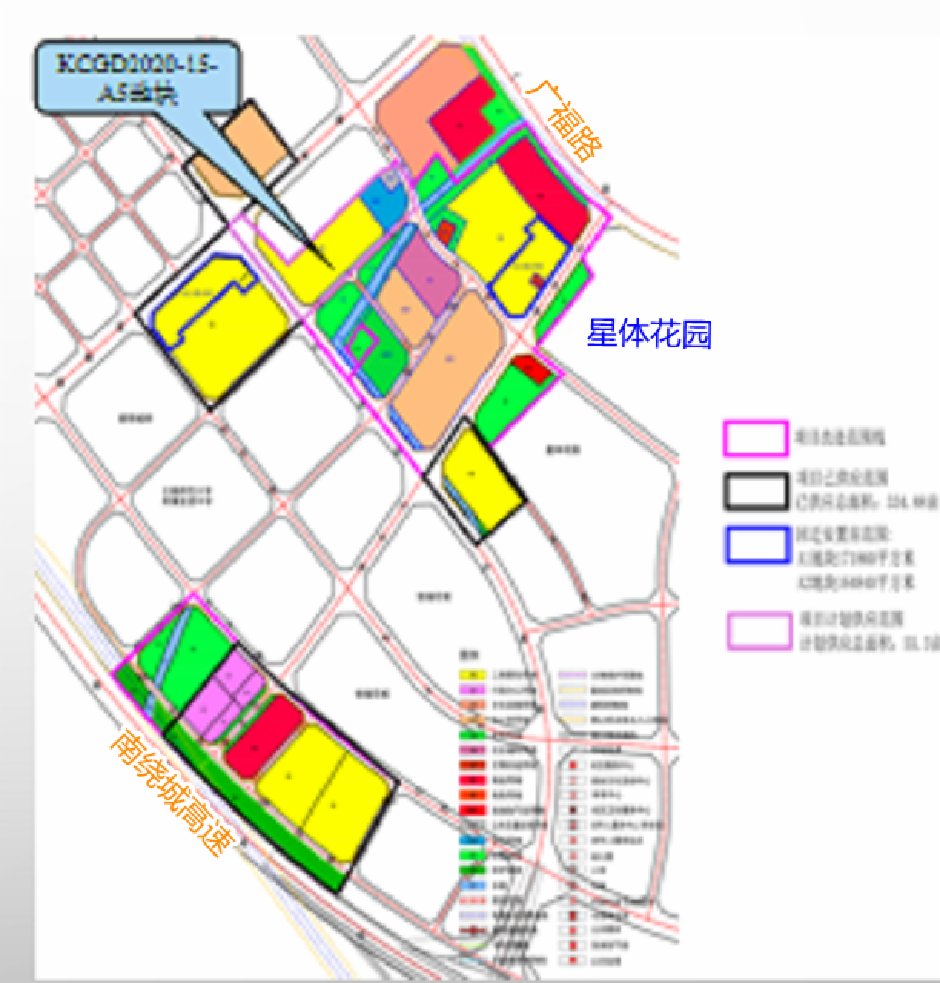 土地編號為KCGD2021-15號,土地性質(zhì)為住宅用地,面積145.09畝,容積率3.1,建筑密度≤22%,綠地率≥40%,高度80米,須配建一所幼兒園。