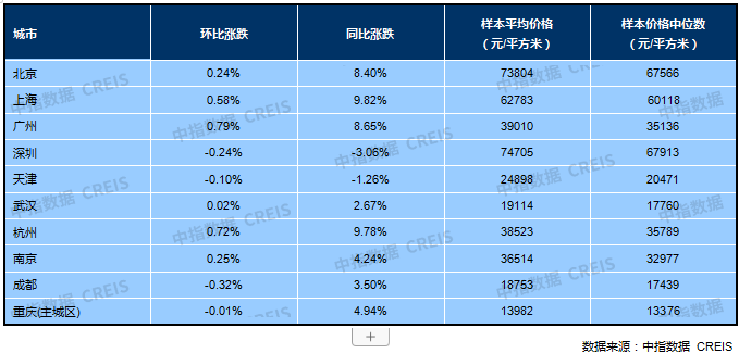 同比來看,十大城市二手住宅平均價格同比上漲4.81%,漲幅較上月收窄0.50個百分點。十大城市中,8個城市同比上漲,2個城市同比下跌。具體來看,上海同比漲幅最高,為9.82%;杭州、廣州和北京漲幅介于5.0%-10.0%之間;重慶(主城區)、南京、成都和武漢同比漲幅在5.0%以內;深圳同比跌幅最大,為3.06%;天津同比下跌1.26%。