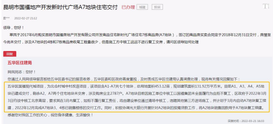 回復稱,計劃于本月內(nèi)啟動復工續(xù)建,到年底完成A7地塊3、4棟已銷售樓棟的交付。在資金方面,協(xié)調(diào)光大銀行開展針對A2地塊的按揭貸款,將銷售回款用于A7地塊復工續(xù)建。
