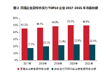 隨著房地產行業進入加速出清、優勝劣汰的階段,百強企業的市場份額小幅下滑。2021年,百強企業市場份額為49.9%,較上年下降0.4個百分點。其中,綜合實力TOP10企業銷售額市場份額為22.5%,較上年下降0.4個百分點。