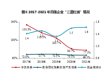 “三道紅線”提出后百強企業積極應對,通過提前償還債務、調整債務結構等方式縮減債務規模,均值已經基本合規。2021年,百強企業在滿足經營需求的前提下調整債務規模及結構,整體負債水平穩中有降,三道紅線指標均值得以進一步優化。百強企業剔除預收賬款的資產負債率、凈負債率的均值分別為69.5%、77.1%,較上年分別下降0.6、3.6個百分點;現金短債比為1.6,較上年上升0.1,整體穩中向好。