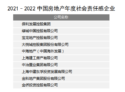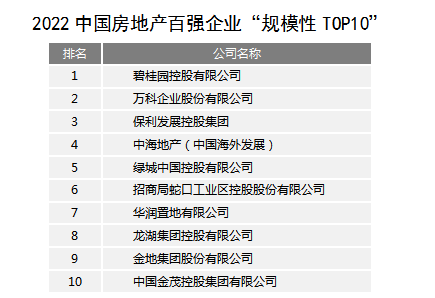 中國房地產TOP10研究組在百強企業研究的基礎上,基于對企業規模性、盈利性、成長性等方面的深入研究,評價產生了2022中國房地產百強企業“綜合實力TOP10”、“規模性TOP10”、“盈利性TOP10”、“成長性TOP10”、“穩健性TOP10”、“融資能力TOP10”、“運營效率TOP10”、“年度社會責任感企業”和“年度扶貧標桿企業”。